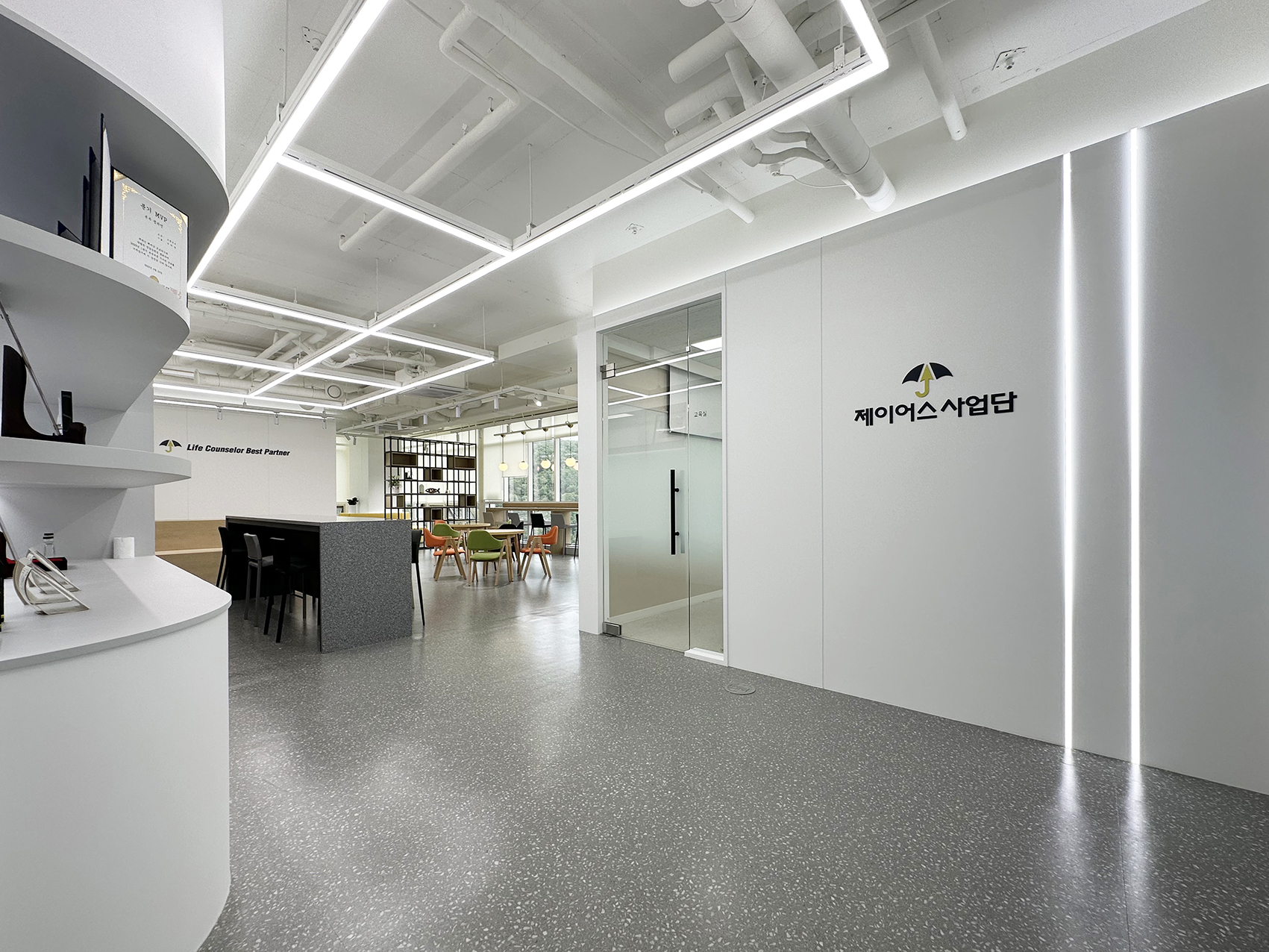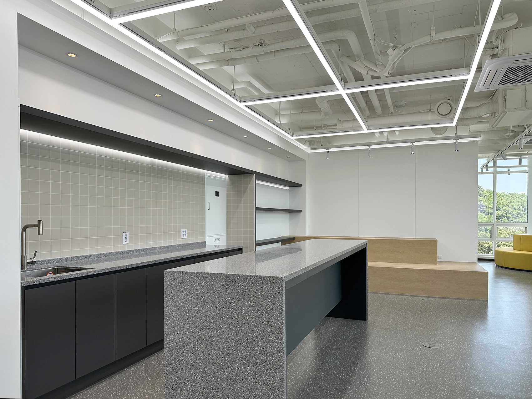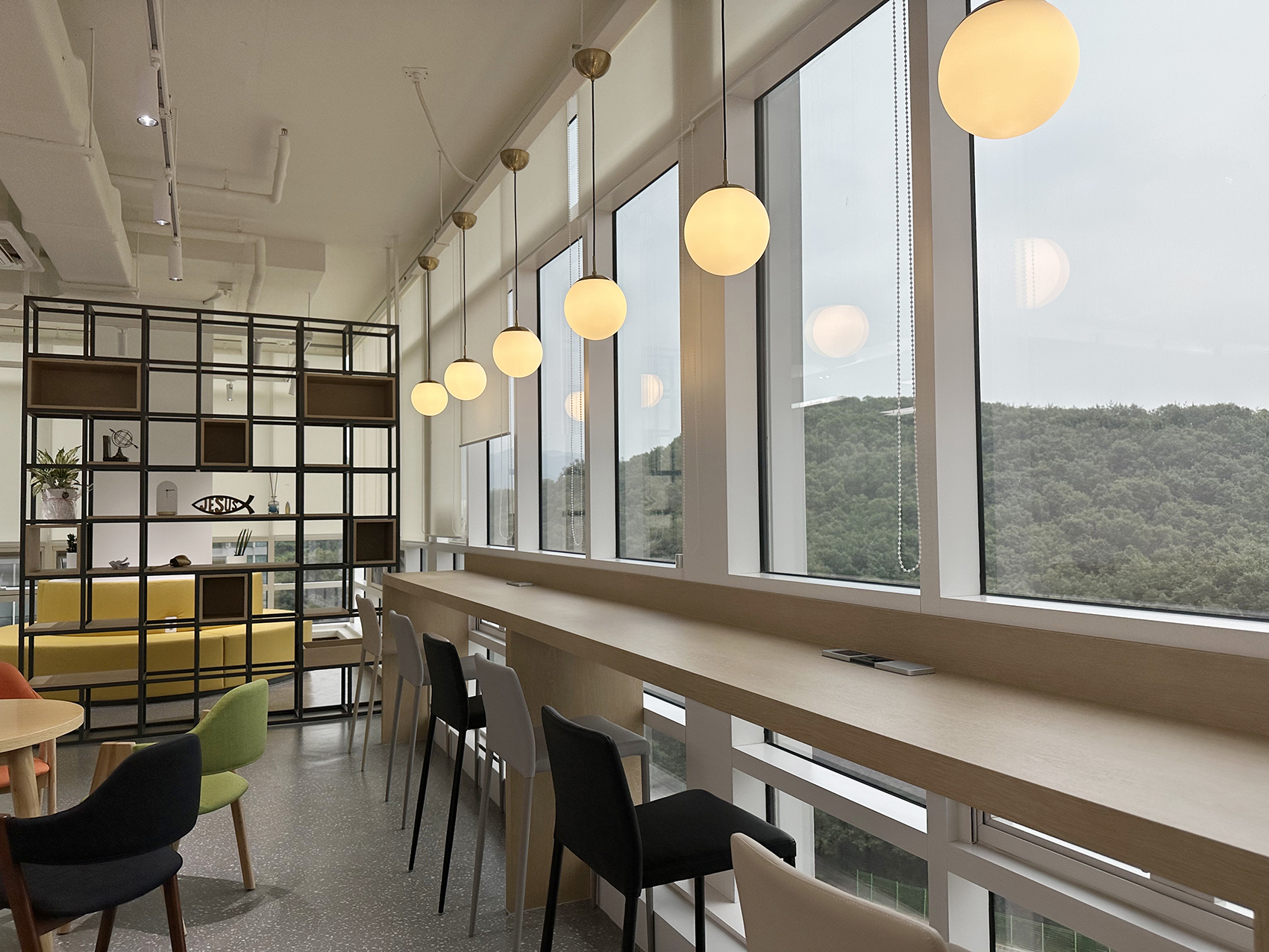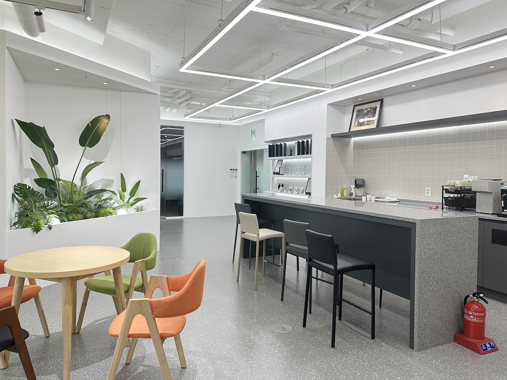 제이어스사업단은 라운지 공간에 바테이블, 계단식 라운지, 붙박이 소파 등 다양한 형태의 가구를 배치하여 공간에 자유로움을 부여하였습니다. 화이트 컬러의 벽과 노출천장이 공간을 더욱 환하게 밝혀주며 그레이톤으로 바닥을 마감하여 공간의 균형을 잡아주고 우드를 더하여 따뜻함을 주었습니다.