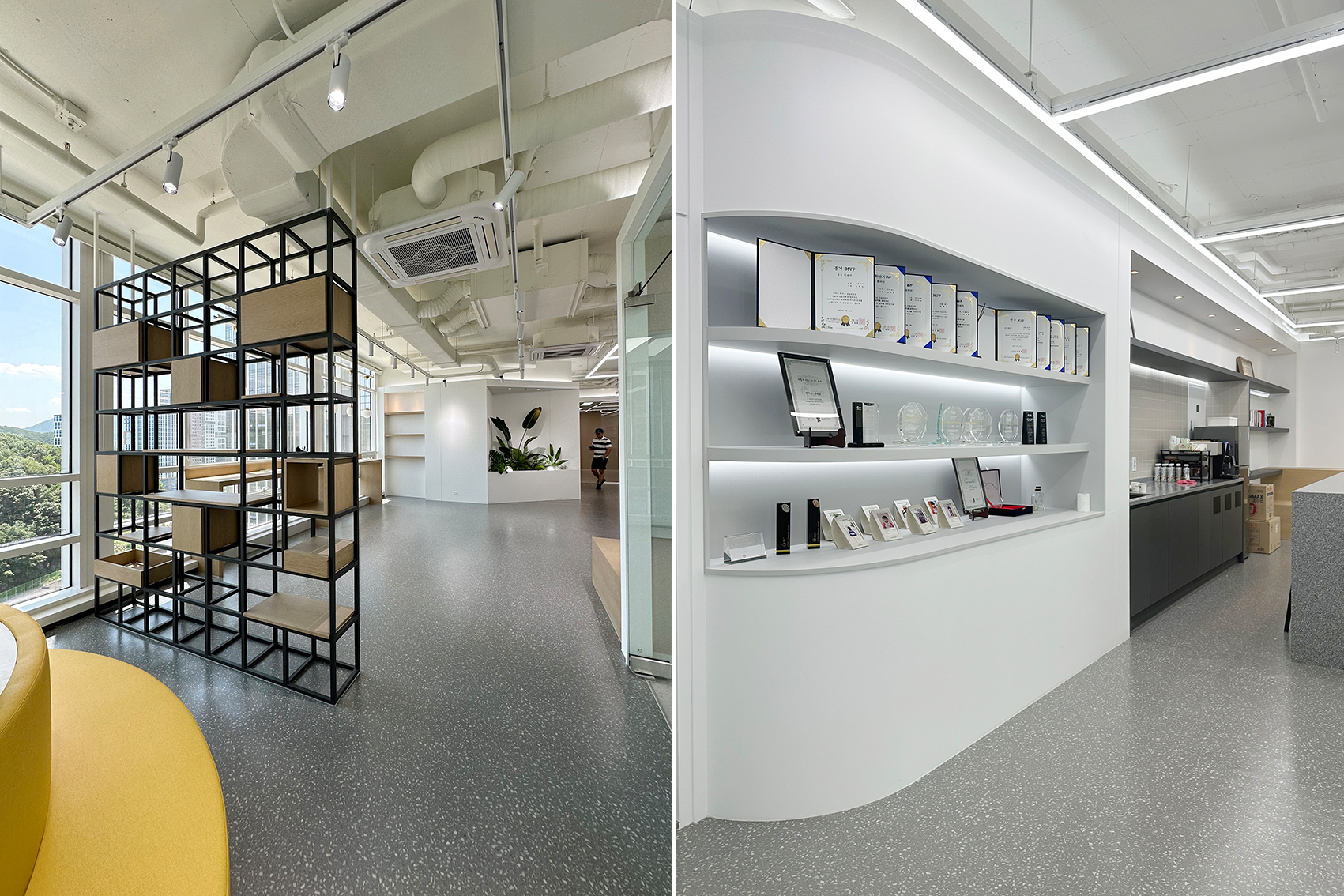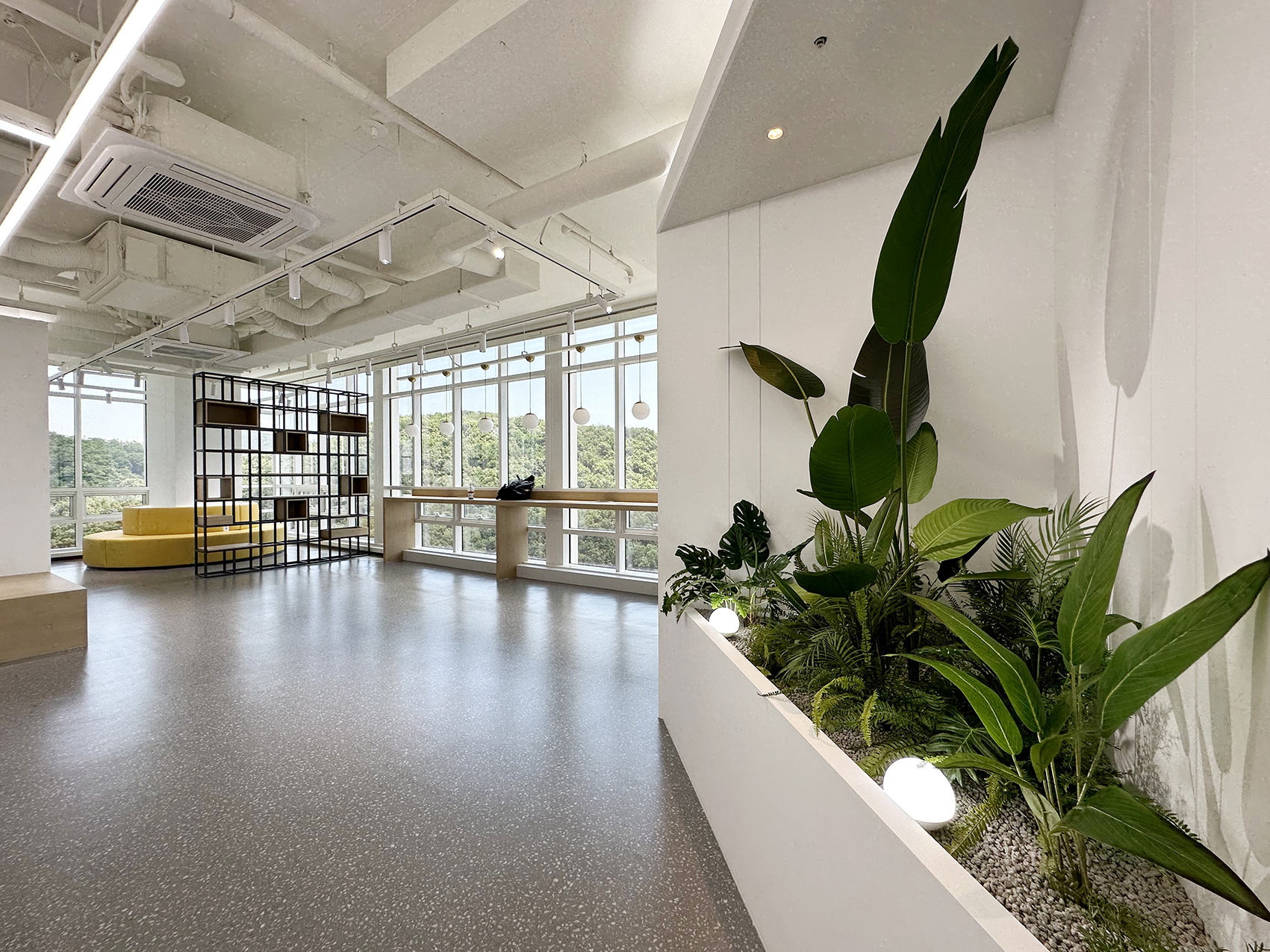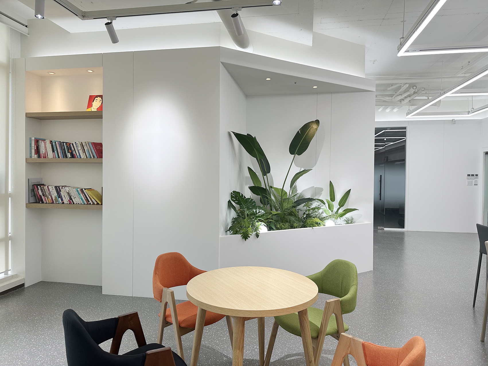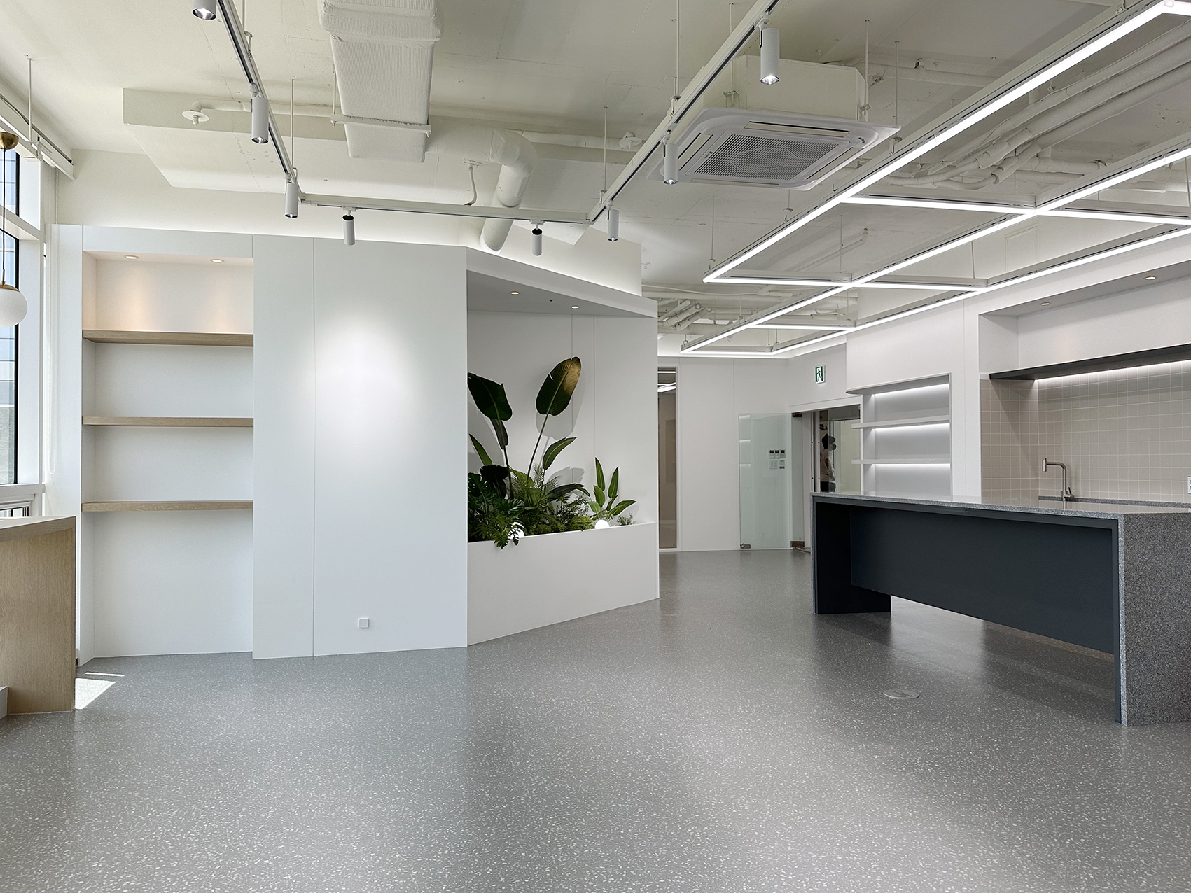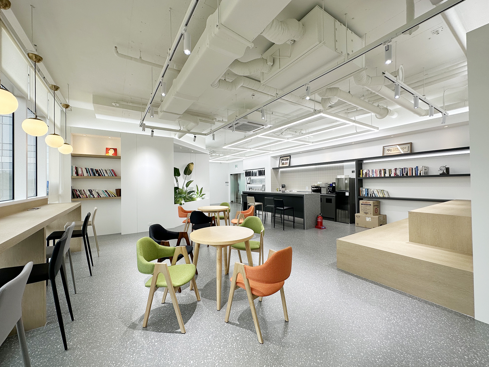 제이어스사업단은 라운지 공간에 바테이블, 계단식 라운지, 붙박이 소파 등 다양한 형태의 가구를 배치하여 공간에 자유로움을 부여하였습니다. 화이트 컬러의 벽과 노출천장이 공간을 더욱 환하게 밝혀주며 그레이톤으로 바닥을 마감하여 공간의 균형을 잡아주고 우드를 더하여 따뜻함을 주었습니다.