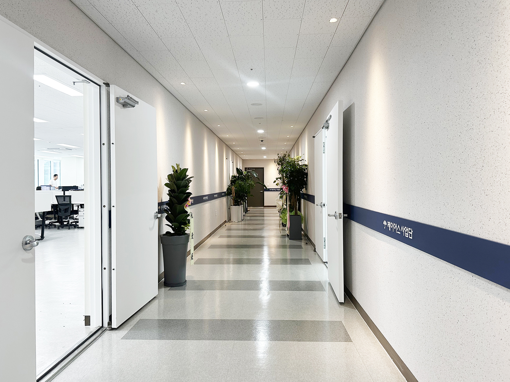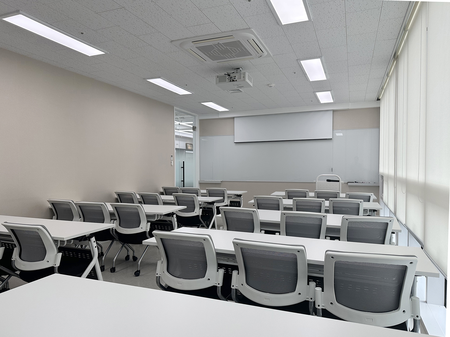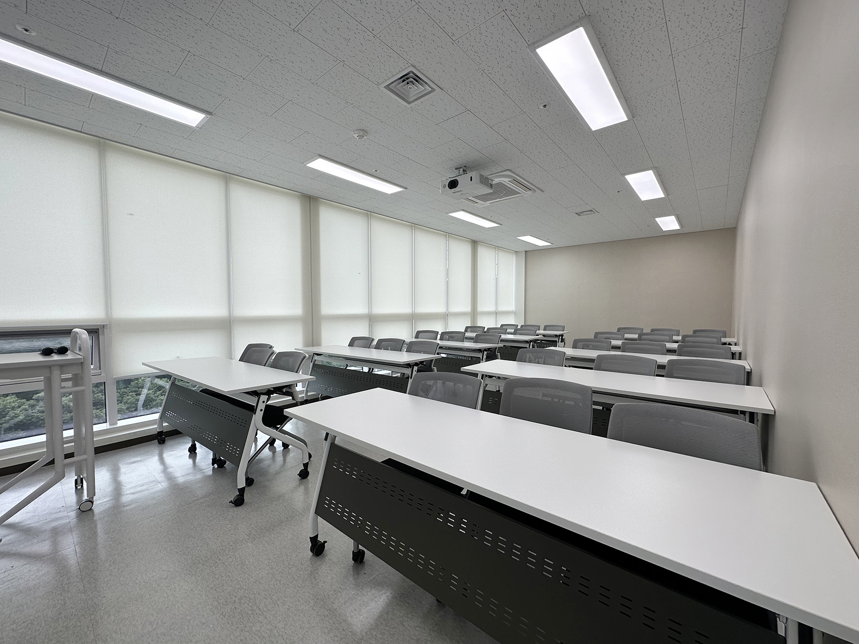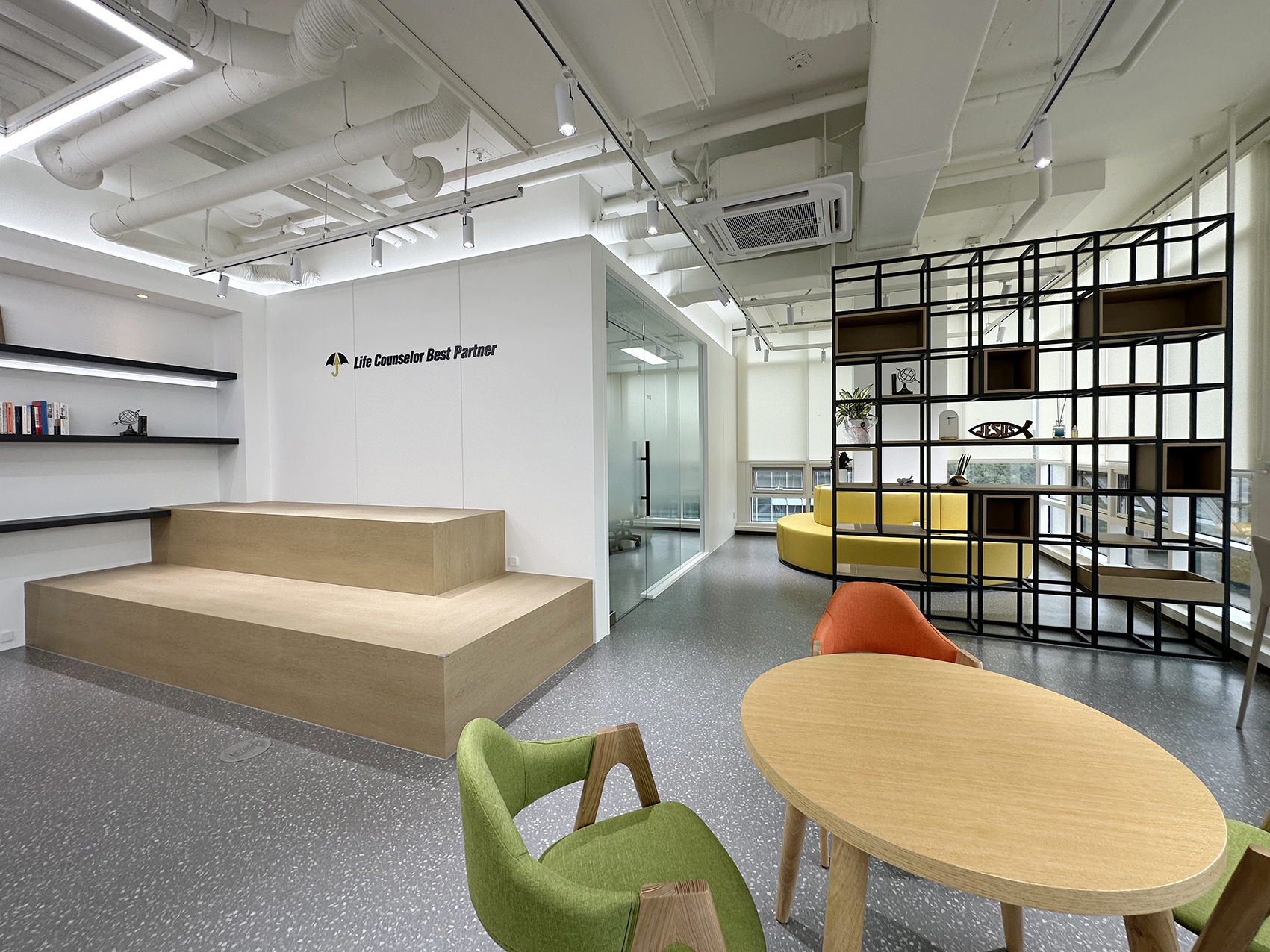 제이어스사업단은 라운지 공간에 바테이블, 계단식 라운지, 붙박이 소파 등 다양한 형태의 가구를 배치하여 공간에 자유로움을 부여하였습니다. 화이트 컬러의 벽과 노출천장이 공간을 더욱 환하게 밝혀주며 그레이톤으로 바닥을 마감하여 공간의 균형을 잡아주고 우드를 더하여 따뜻함을 주었습니다.